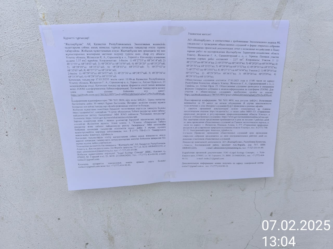 1.4. Описание для подключения к онлайн трансляции при прохождении общественного слушания: в соответствии с пп.4, п.11 прил. 3 Правил, информация о проведении общественных слушаний должна быть распространена на государственном и русском языках на досках объявлений местных исполнительных органов административно-территориальных единиц и в местах, специально предназначенных для размещения объявлений. В связи с чем необходимо дополнительно разместить печатные объявления на досках объявлений в акимате и в местах, специально предназначенных для размещения объявлений.