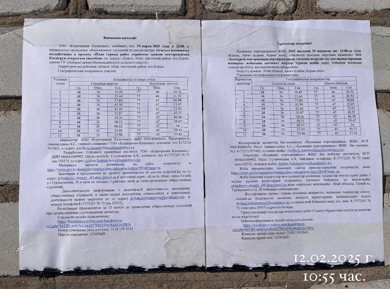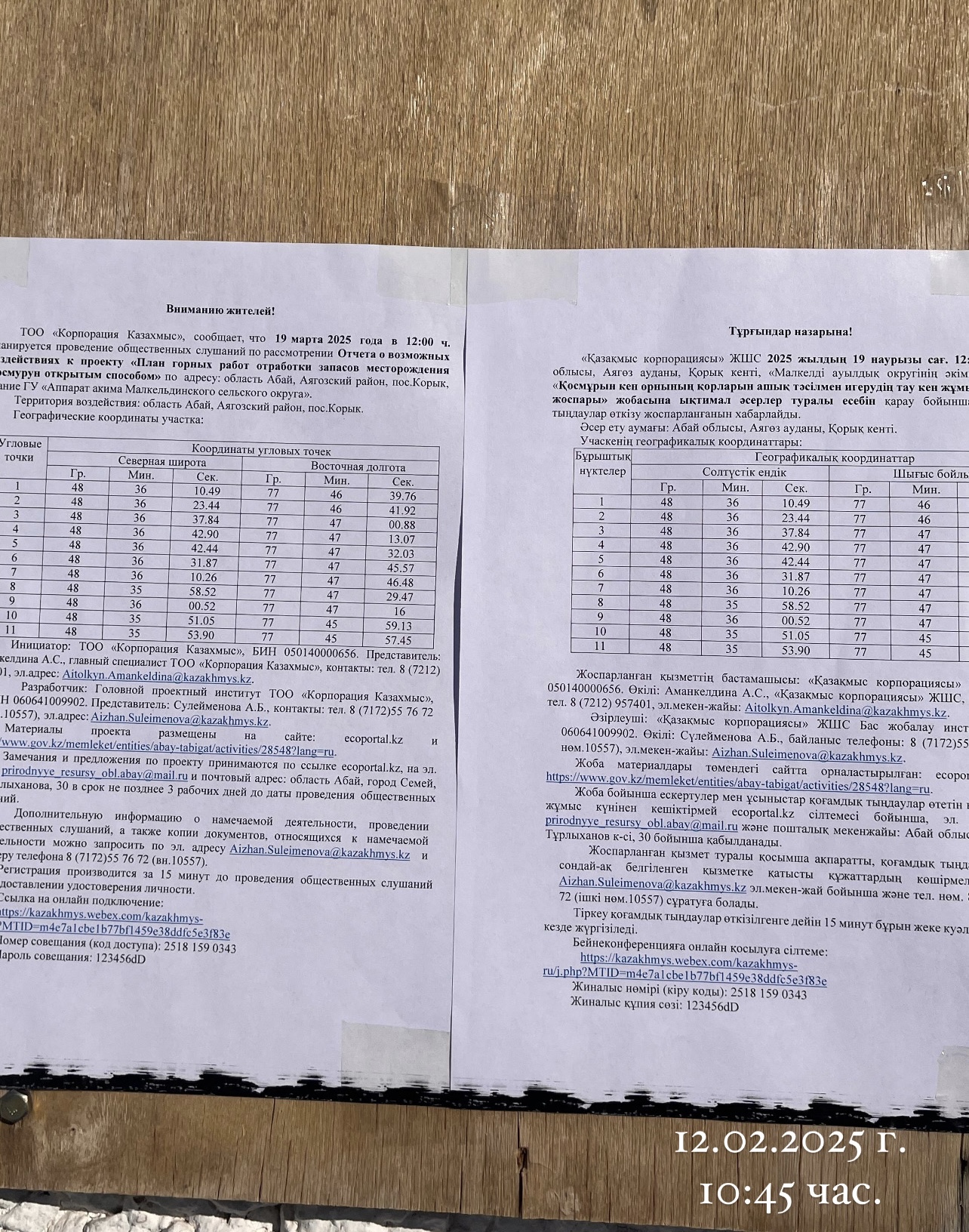 1.2. Место проведения: область Абай, Аягозский район, Малгельдинский с.о., с.Корык. Здание ГУ «Аппарат акима Малкельдинского сельского округа Аягозского района», улица Байкотан би, 13. Ссылка на онлайн подключение: https://kazakhmys.webex.com/kazakhmys-ru/j.php?MTID=m4e7a1cbe1b77bf1459e38ddfc5e3f83e Номер совещания (код доступа): 2518 159 0343 Пароль совещания: 123456dD