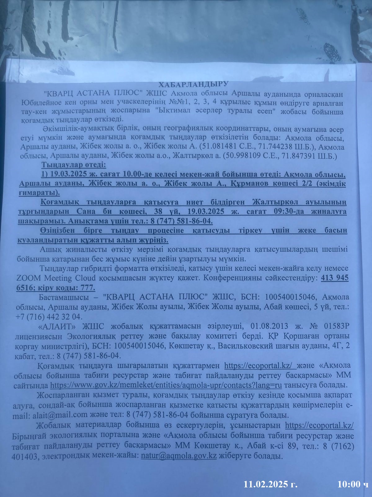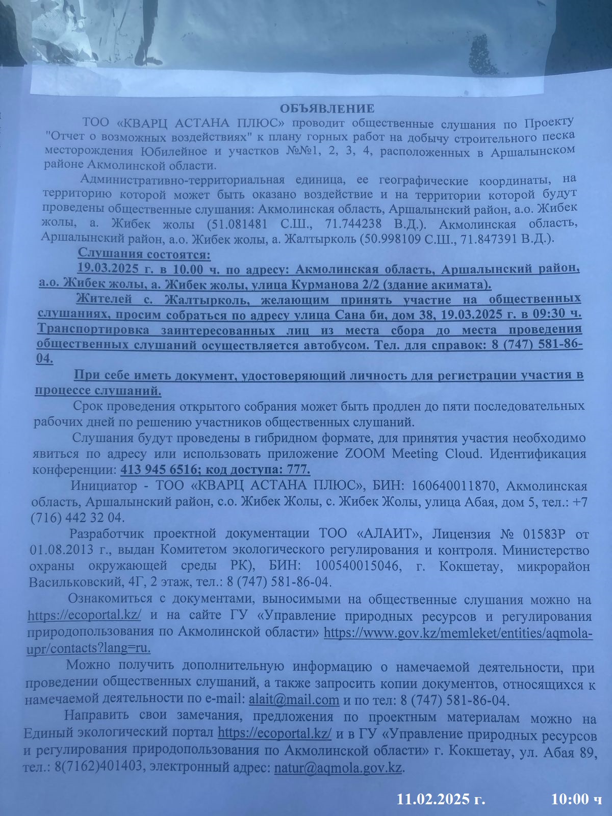 4. Повестка дня общественных слушаний: План горных работ на добычу строительного песка месторождения Юбилейное и участков №№1, 2, 3, 4, расположенных в Аршалынском районе Акмолинской области выполнен по заданию на проектирование ТОО «КВАРЦ АСТАНА ПЛЮС». Месторождение Юбилейное было разведано в 2004 году в соответствии с условиями контракта №30/04 от 29.06.2004г на площади геологического отвода №148 от 05.04.2004г. Геологоразведочные работы проводились на основании Контракта на проведение совмещенной разведки и добычи строительного песка на участке Юбилейное Аршалынского района Акмолинской области Республики Казахстан, заключенного между Акимом Акмолинской области и ТОО «Кварц-АС» 29 июня 2004 года. В 2007-2008 годах был произведен прирост запасов, расширена контрактная территория и утверждены запасы песков на участках №1 и №2: - дополнение к контракту от 29 июня 2004 года № 30/-04 на проведение совмещенной разведки и добычи строительного песка на участке Юбилейное Аршалынского района Акмолинской области Республики Казахстан между ГУ «Департамент предпринимательства и промышленности Акмолинской области» и ТОО «Кварц-АС» (рег.№236 от 5 января 2007г); - дополнение к контракту от 29 июня 2004 года № 30/-04 на проведение совмещенной разведки и добычи строительного песка на участке Юбилейное Аршалынского района Акмолинской области Республики Казахстан между ГУ «Департамент предпринимательства и промышленности Акмолинской области» и ТОО «Кварц-АС» (рег.№419 от 18 марта 2008г). В 2014 году ГУ «Управление предпринимательства и промышленности Акмолинской области» выдало разрешение на расширение контрактной территории. Геологоразведочные работы проводились в пределах участков расширения контрактной территории. Геологоразведочные работы выполнены в пределах геологического отвода №555 от 14.08.2014г выданного РГУ МД «Центрказнедра». По результатам геологоразведочных работ были Протоколом ЦК МКЗ №1512 от 16.02.2015 года утверждены запасы строительного песка по категории С2 в количестве – 298,3 тыс.м3. Для осуществления операций по недропользованию на добычу строительного песка месторождения Юбилейное ТОО «КВАРЦ АСТАНА ПЛЮС» выдан горный отвод №1312 общей площадью 53,87га (участок Юбилейное – 4,34га, участок №1 – 27,06га, участок №2 – 13,31га, участок №3 – 3,02га, участок №4 – 6,14га). Глубина разработки составляет от 2,0 до 6,6м. В 2023 году ГУ «Управление предпринимательства и промышленности Акмолинской области» письмом №01-06/4549 от 01.12.2023 года выдало разрешение на расширение контрактной территории на площадь 5,6га. Разведочные работы проведены в пределах геологического отвода №775 от 19.12.2023 года. Протоколом заседания Северо-Казахстанской межрегиональной комиссии по запасам полезных ископаемых №6 от 20.08.2024 года на участке прироста запасов утверждены запасы строительного песка в количестве 182,7тыс.м3. Всего объем запасов на месторождении «Юбилейный» с учетом прироста запасов составит 470,1тыс.м3. В 2024 году планируется добыть 70,6тыс. м3. На конец 2024 года запасы составят 399,5тыс. м3. Месторождение Юбилейное и участки №№1,2,3,4, расположены в Аршалынском районе Акмолинской области, в 32,0км к юго-востоку от г.Астана. Месторождение Юбилейное. Ближайшие населенные пункты: - с. Жибек Жолы, расположенное в 2,2км к северо-западу от участка; - с. Жалтырколь, расположенное в 3,4км к югу участка. Ближайшие водный объе