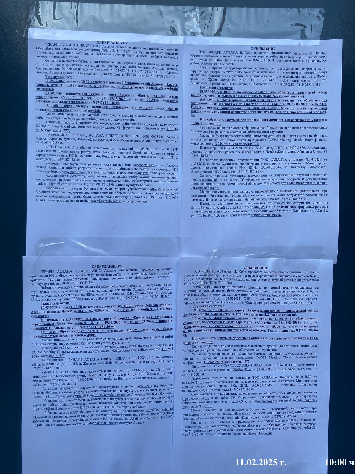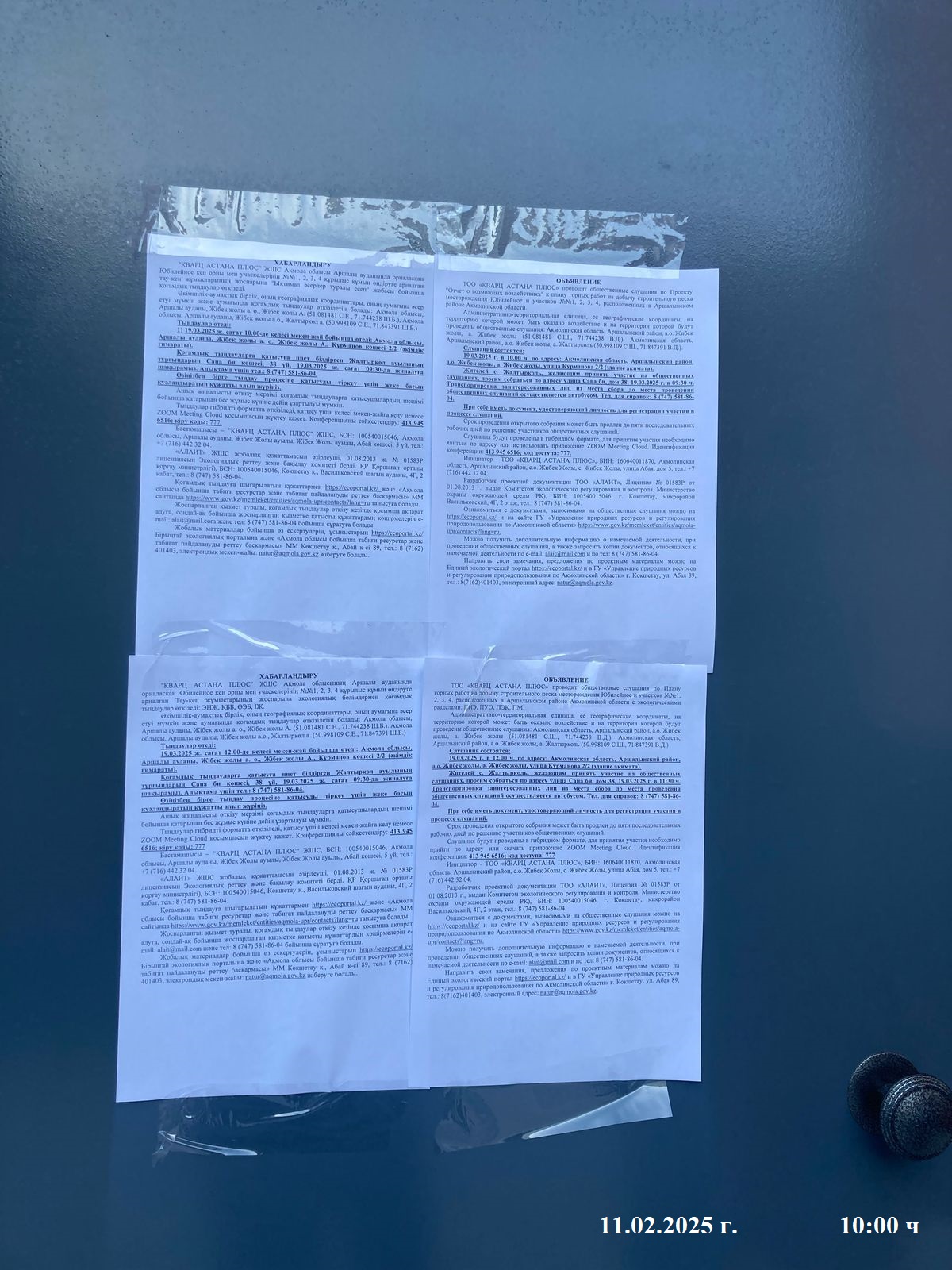 3. Общественные слушания организованны: Управление природных ресурсов и регулирования природопользования Акмолинской области, expeco@mail.ru,
