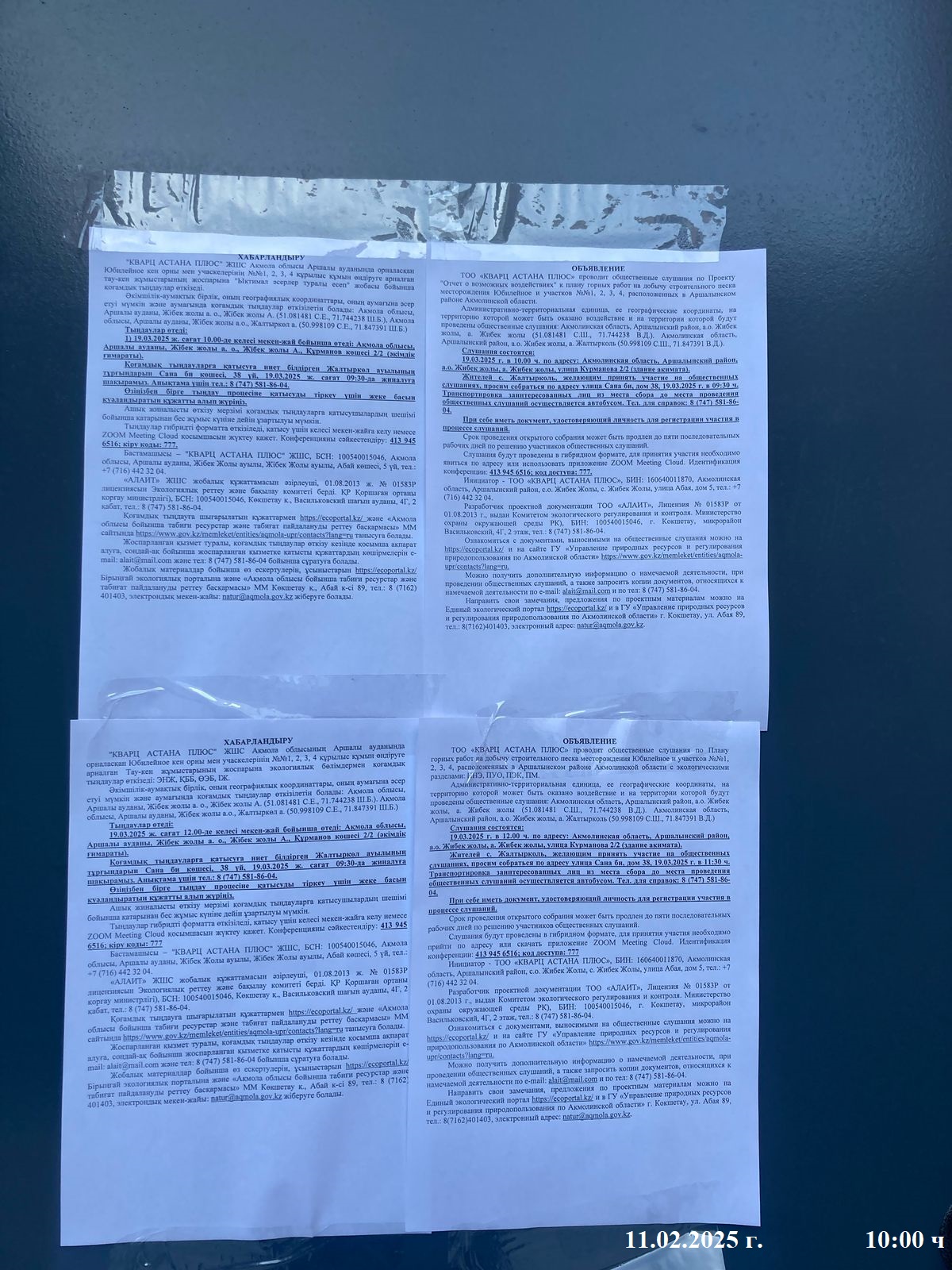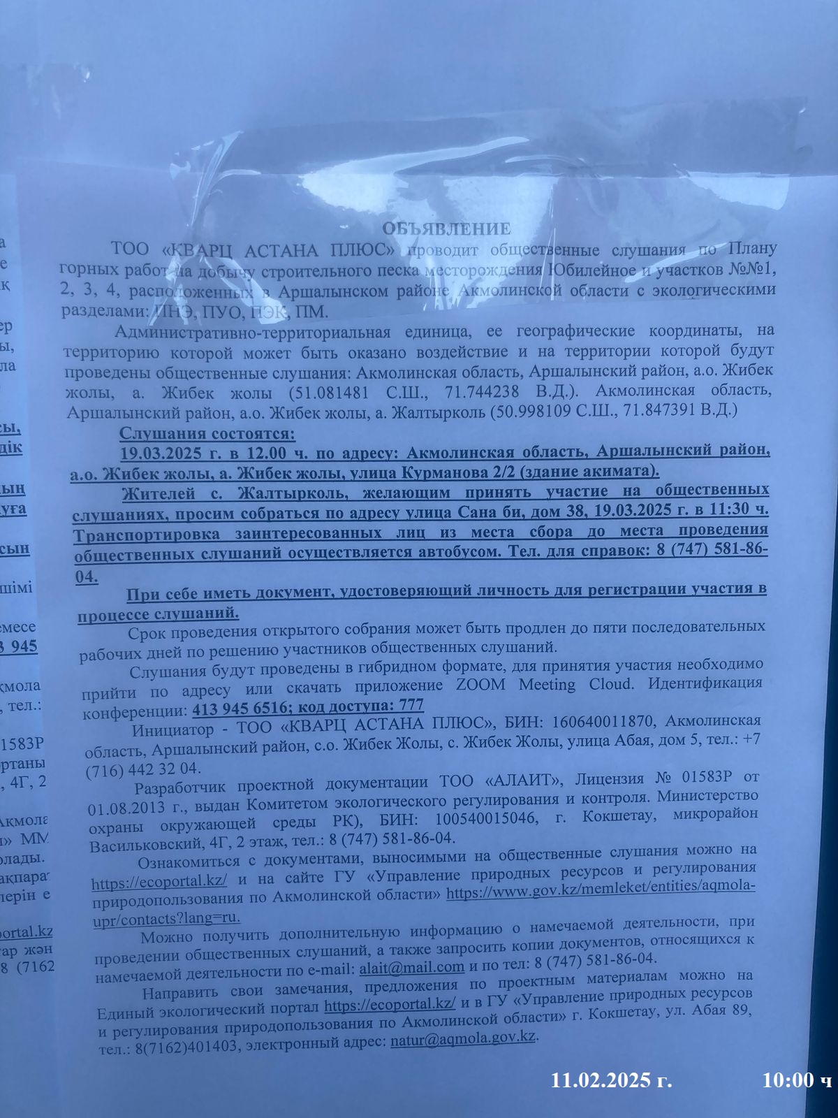 3. Общественные слушания организованны: Управление природных ресурсов и регулирования природопользования Акмолинской области, expeco@mail.ru,
