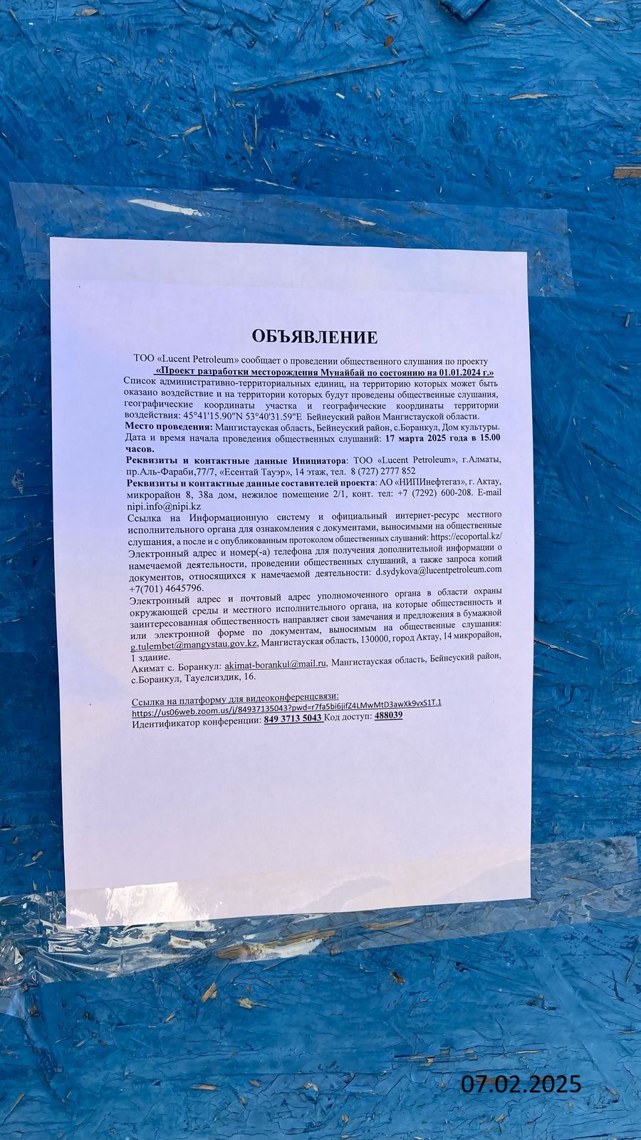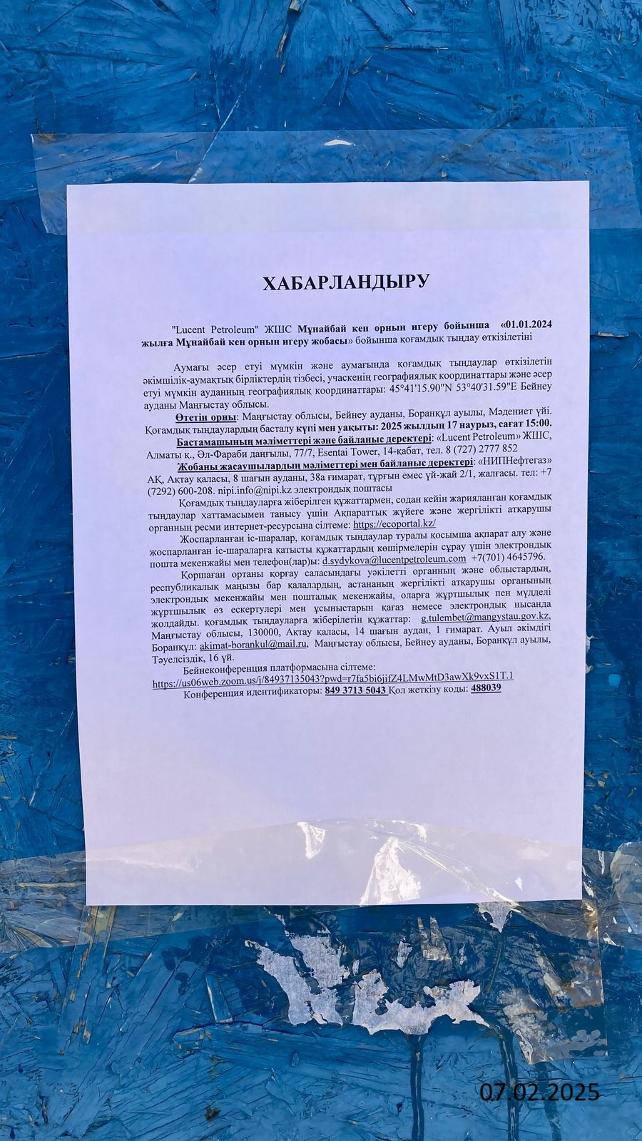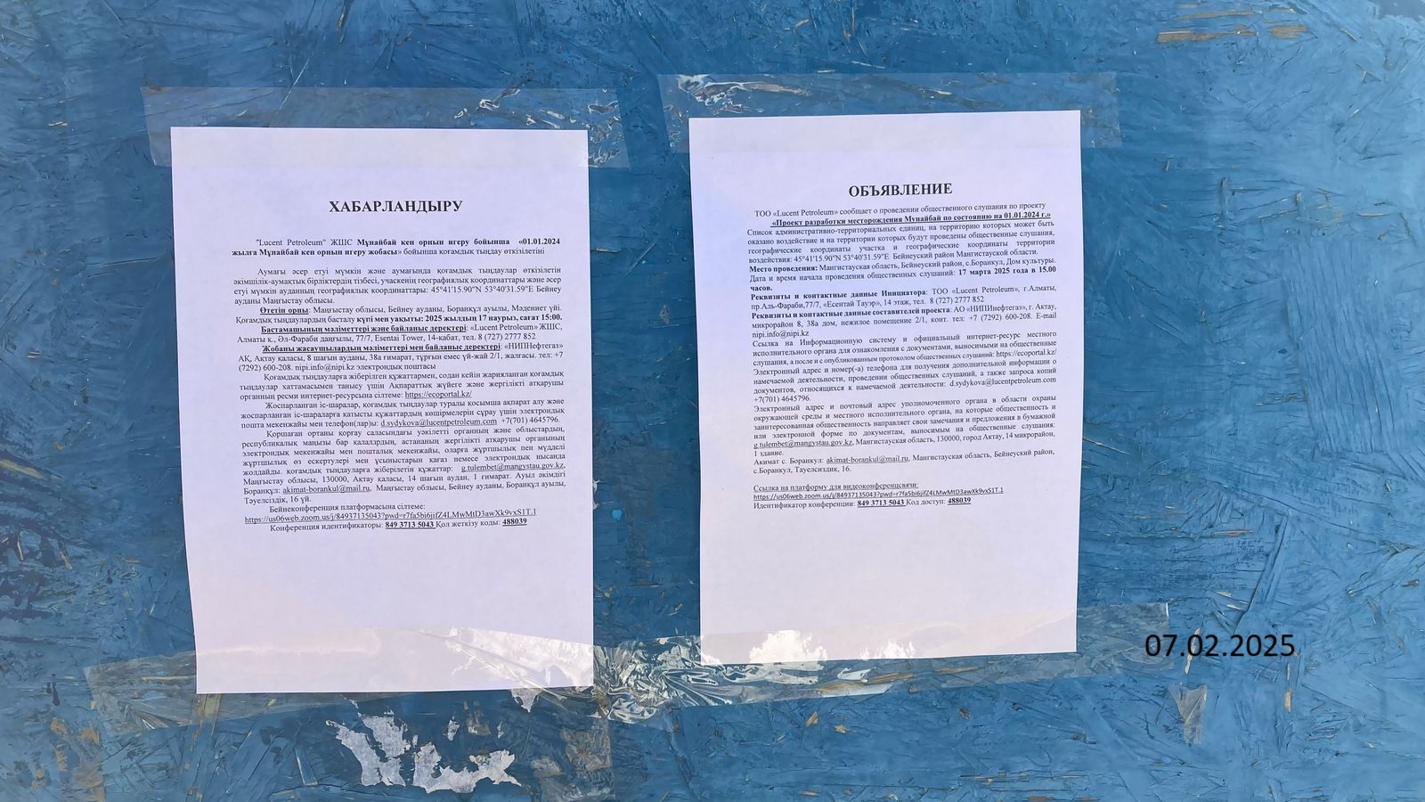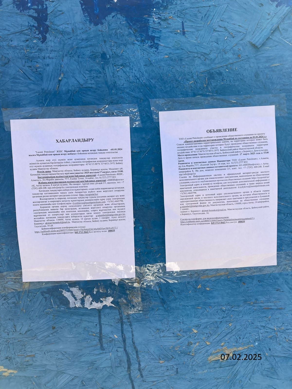 3. Общественные слушания организованны: Управление природных ресурсов и регулирования природопользования Мангистауской области, g.tulembet@mangystau.gov.kz,