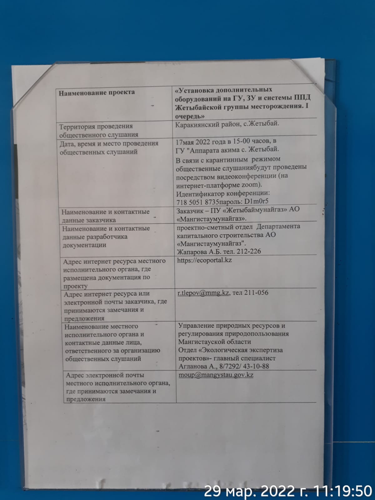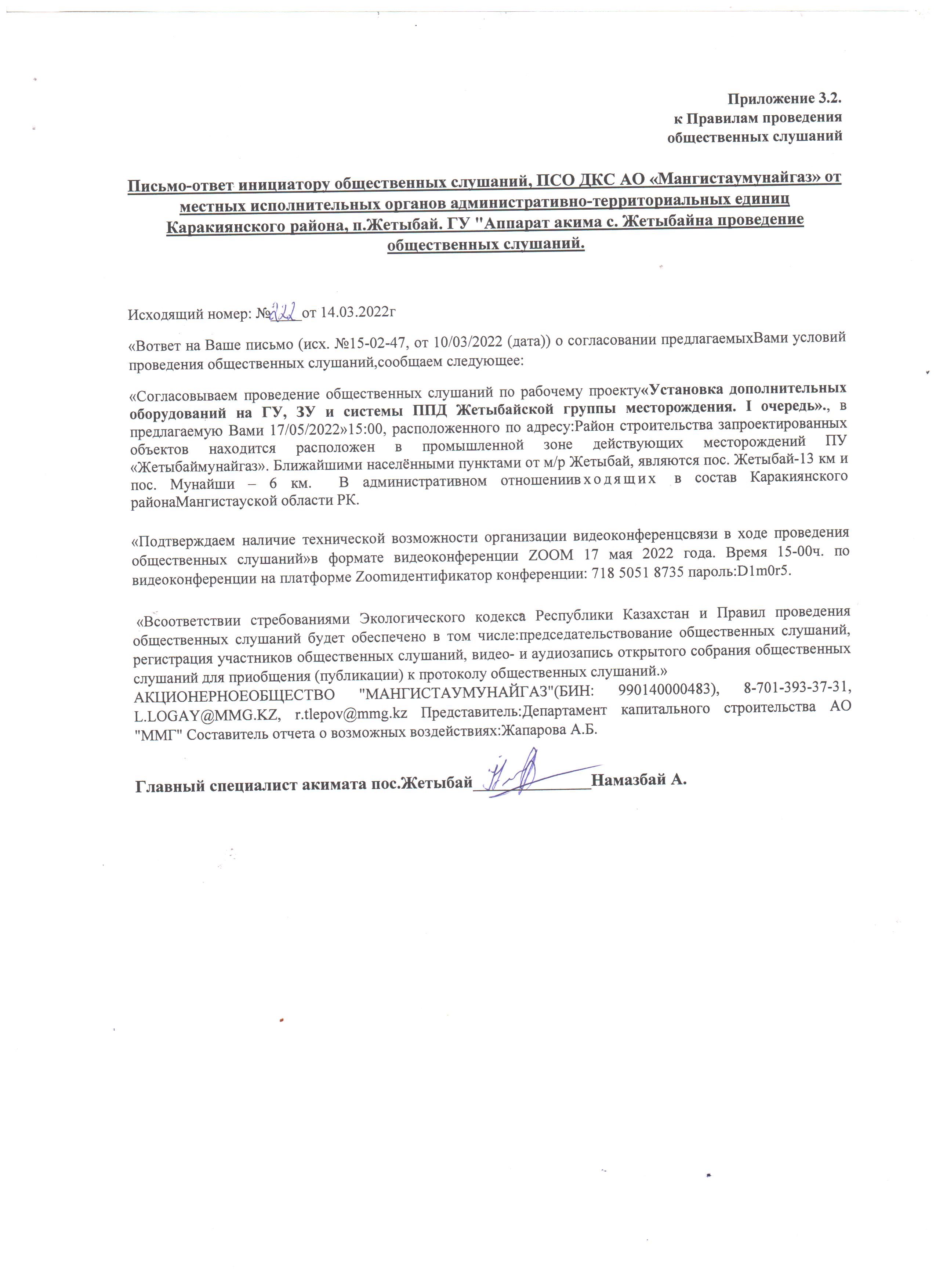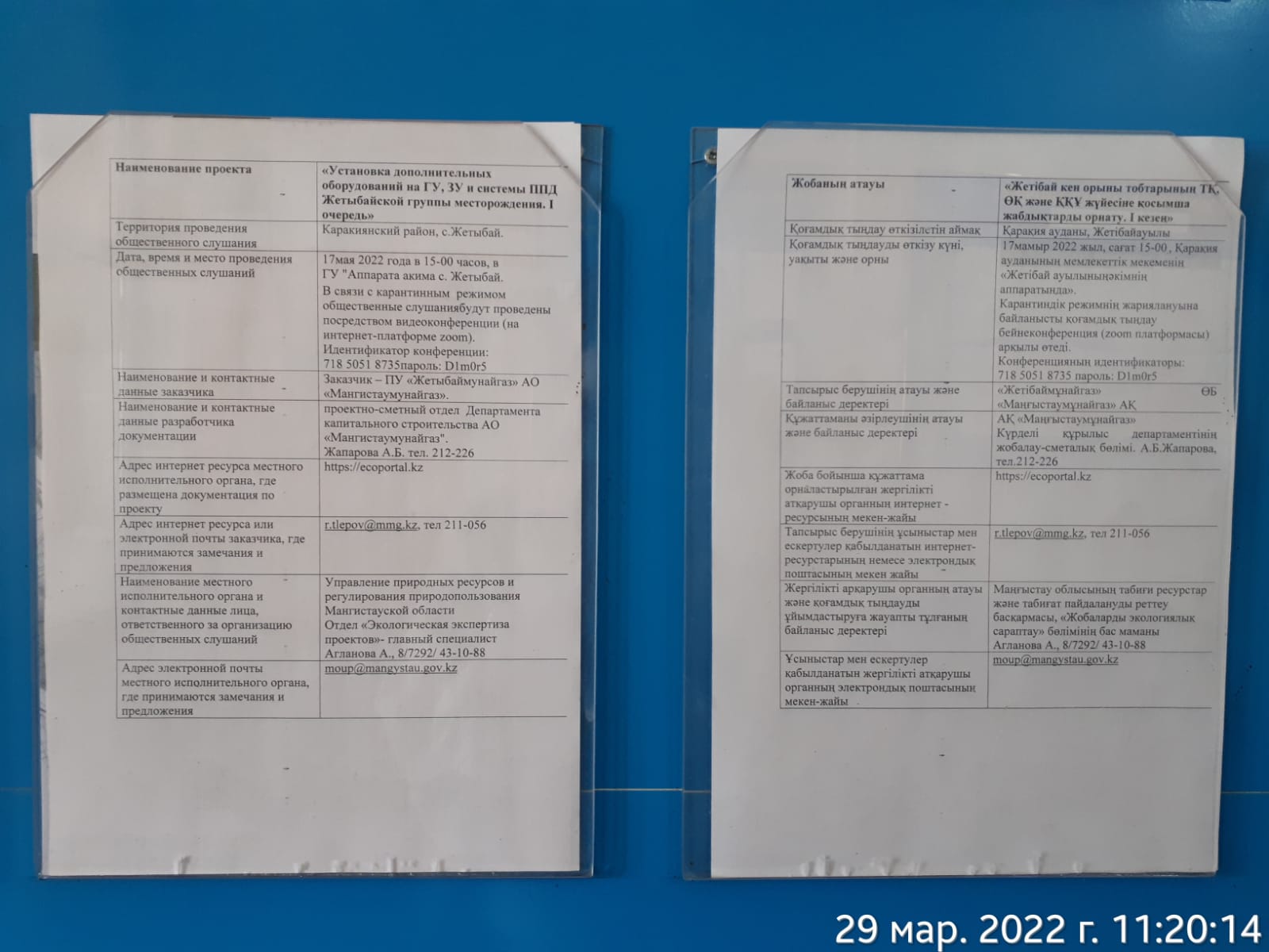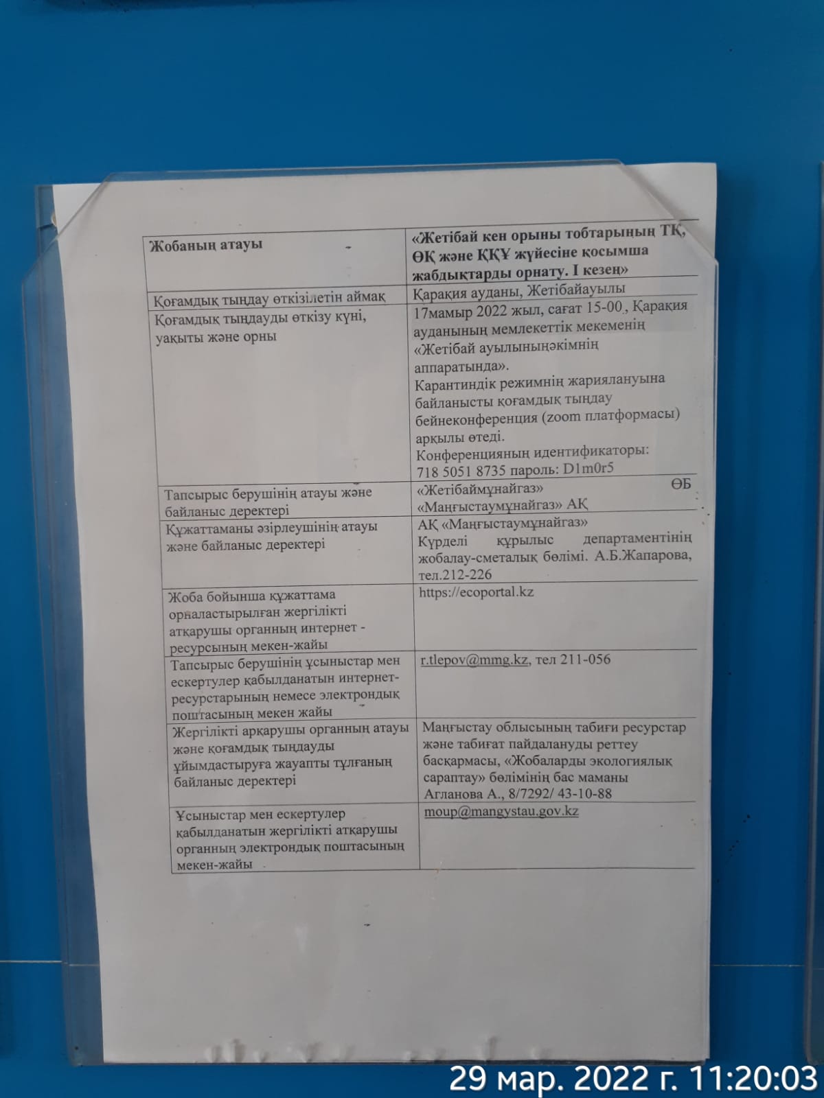 3. Общественные слушания организованны: Управление природных ресурсов и регулирования природопользования Мангистауской области, g.tulembet@mangystau.gov.kz,
