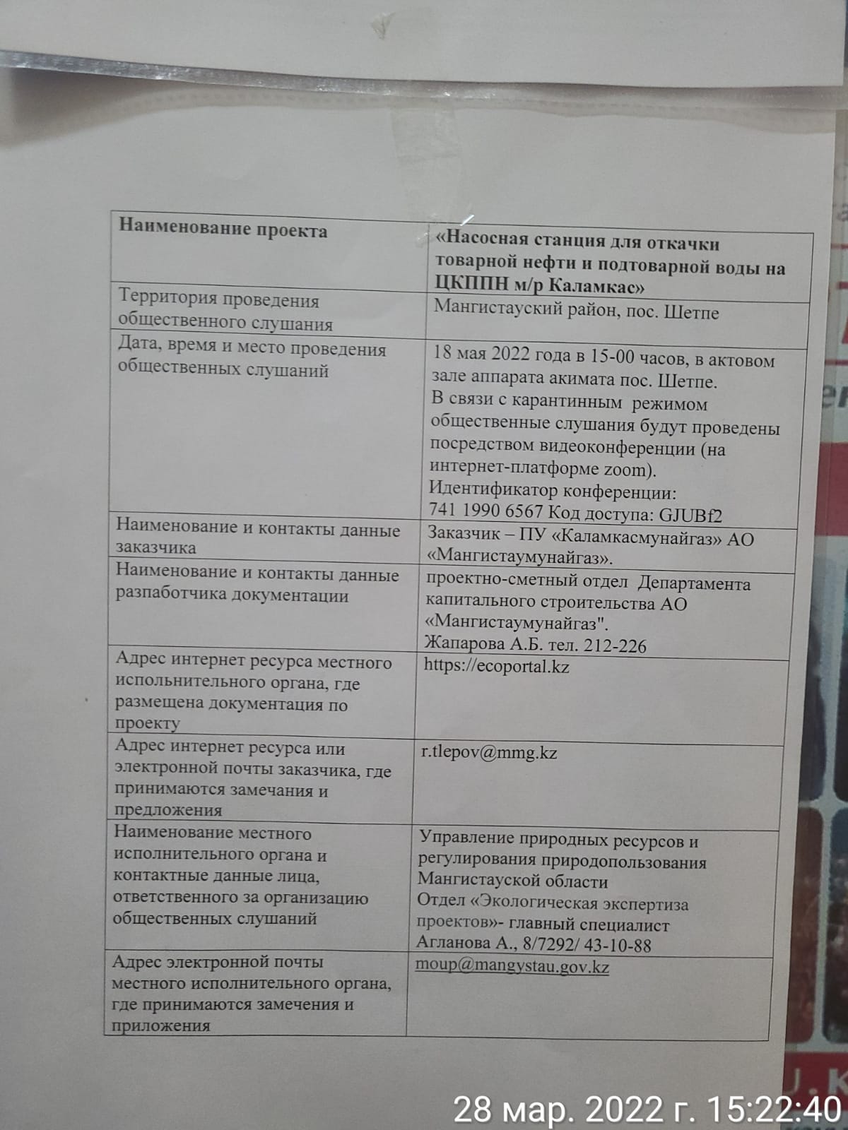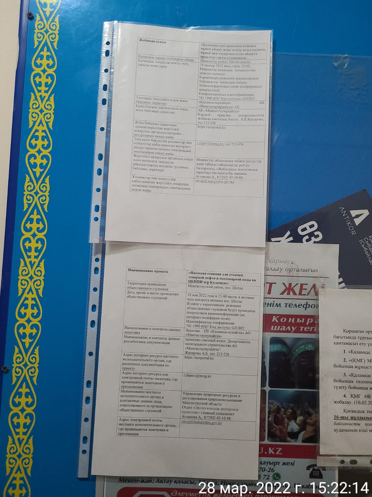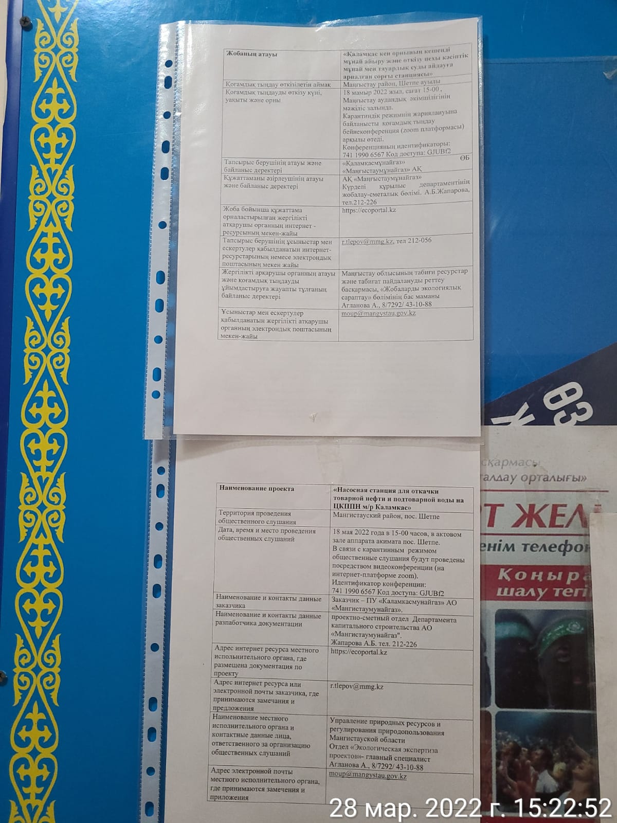 3. Общественные слушания организованны: Управление природных ресурсов и регулирования природопользования Мангистауской области, g.tulembet@mangystau.gov.kz,
