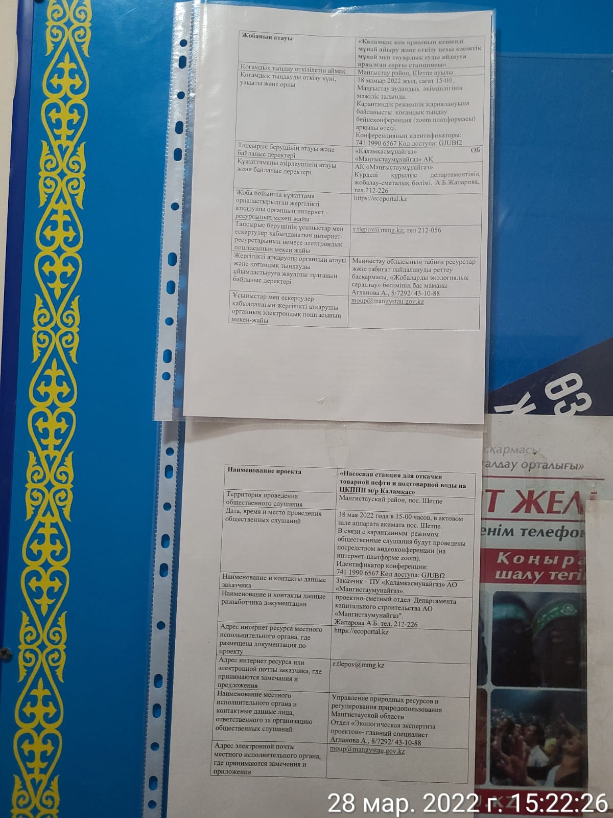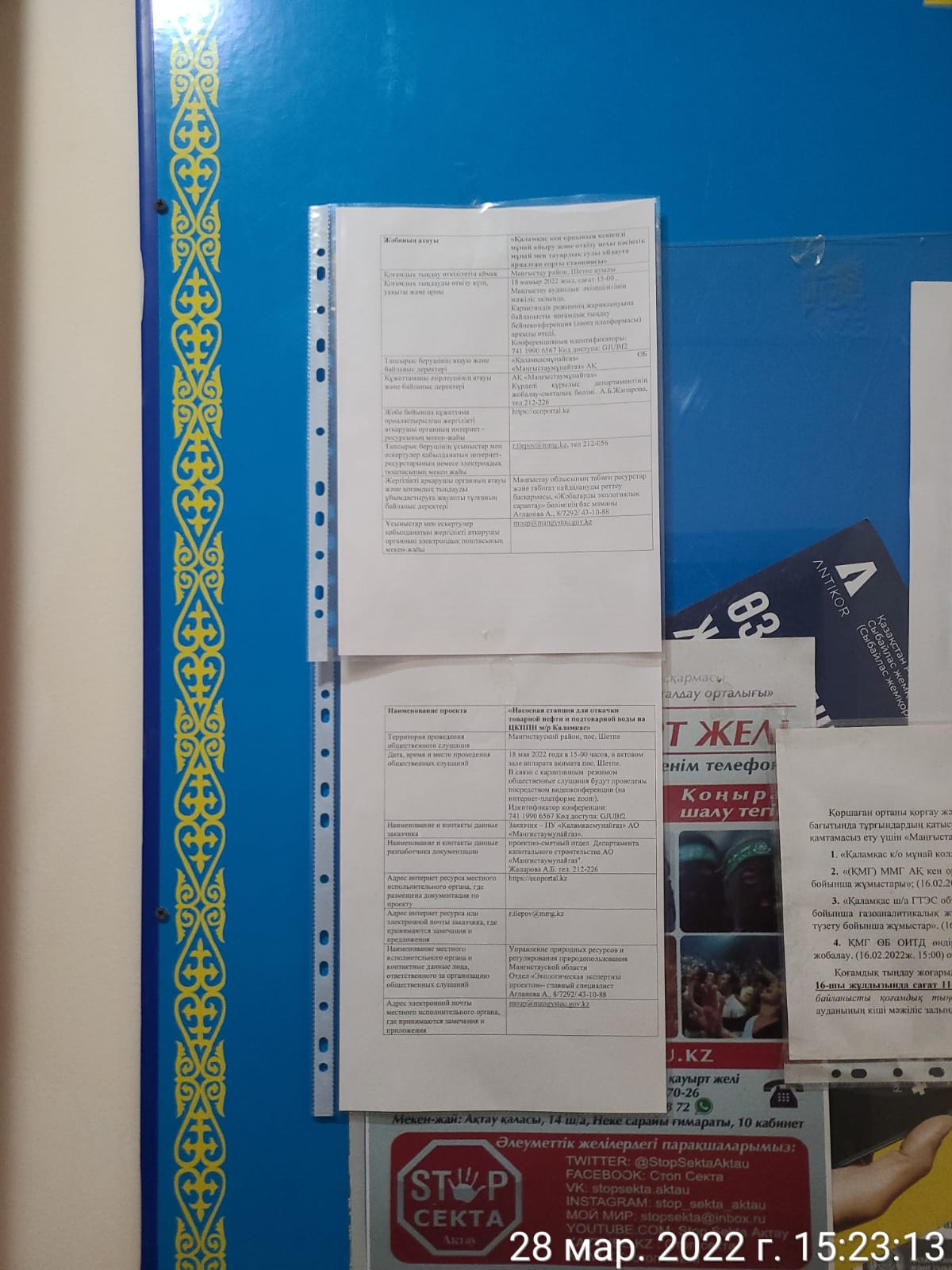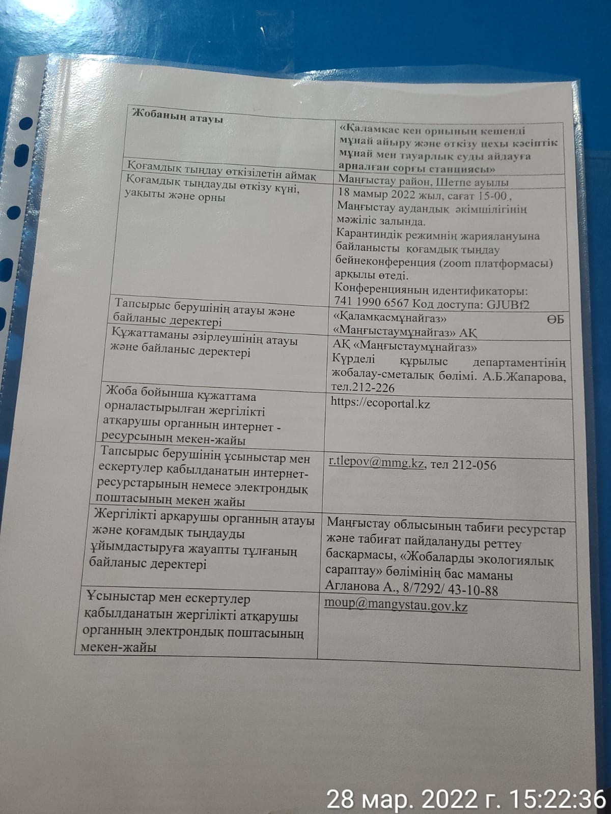 3. Общественные слушания организованны: Управление природных ресурсов и регулирования природопользования Мангистауской области, g.tulembet@mangystau.gov.kz,