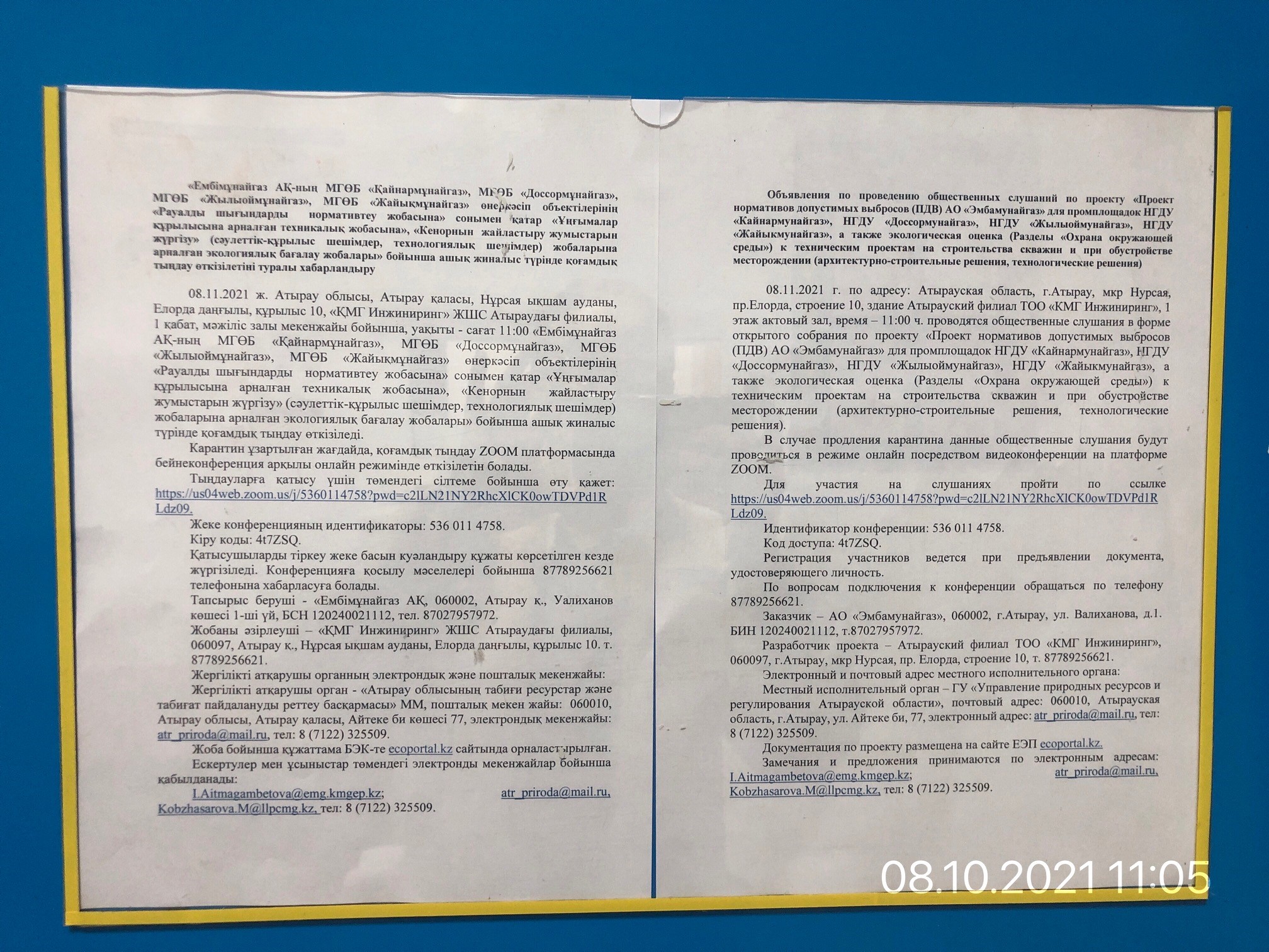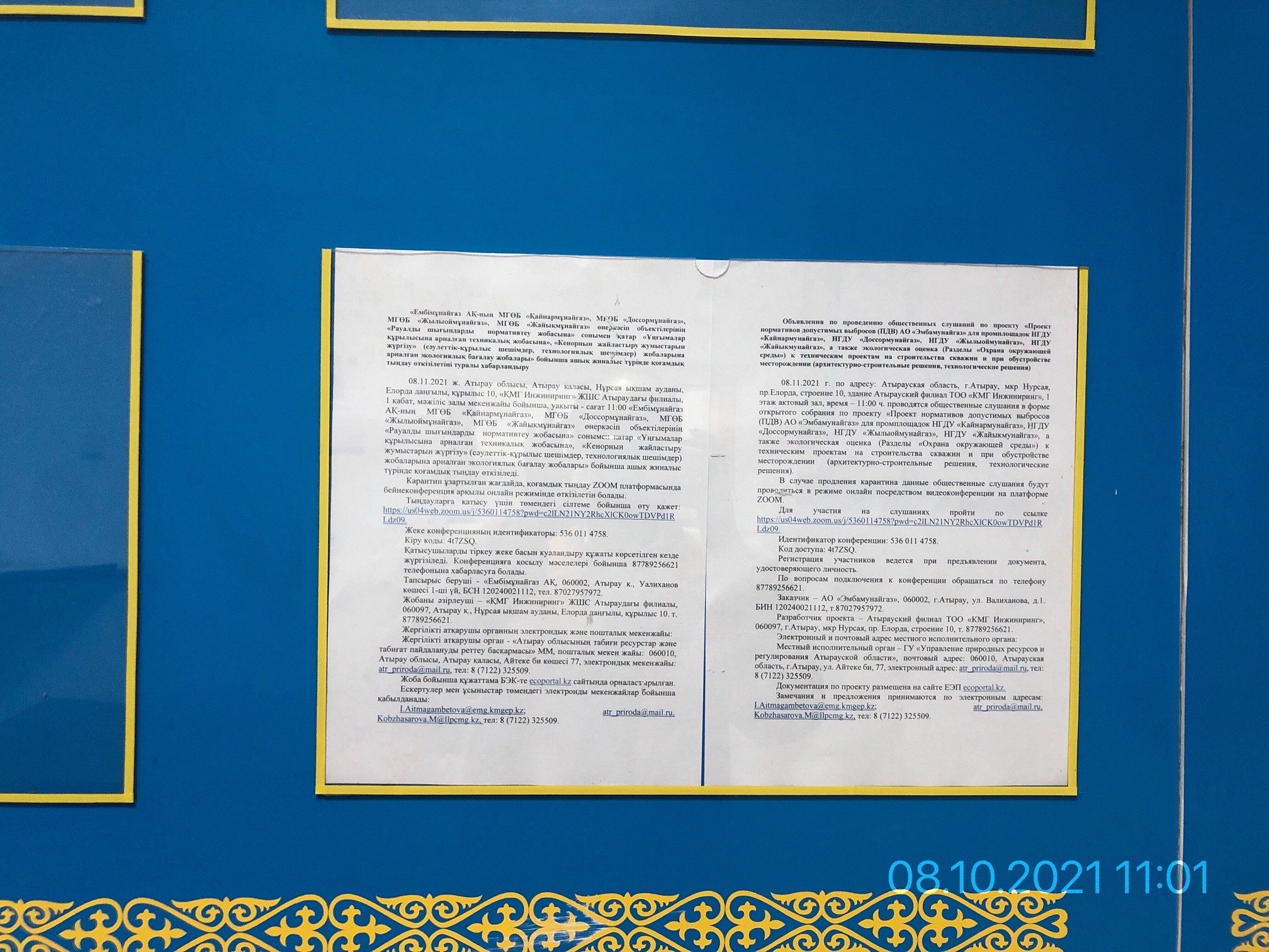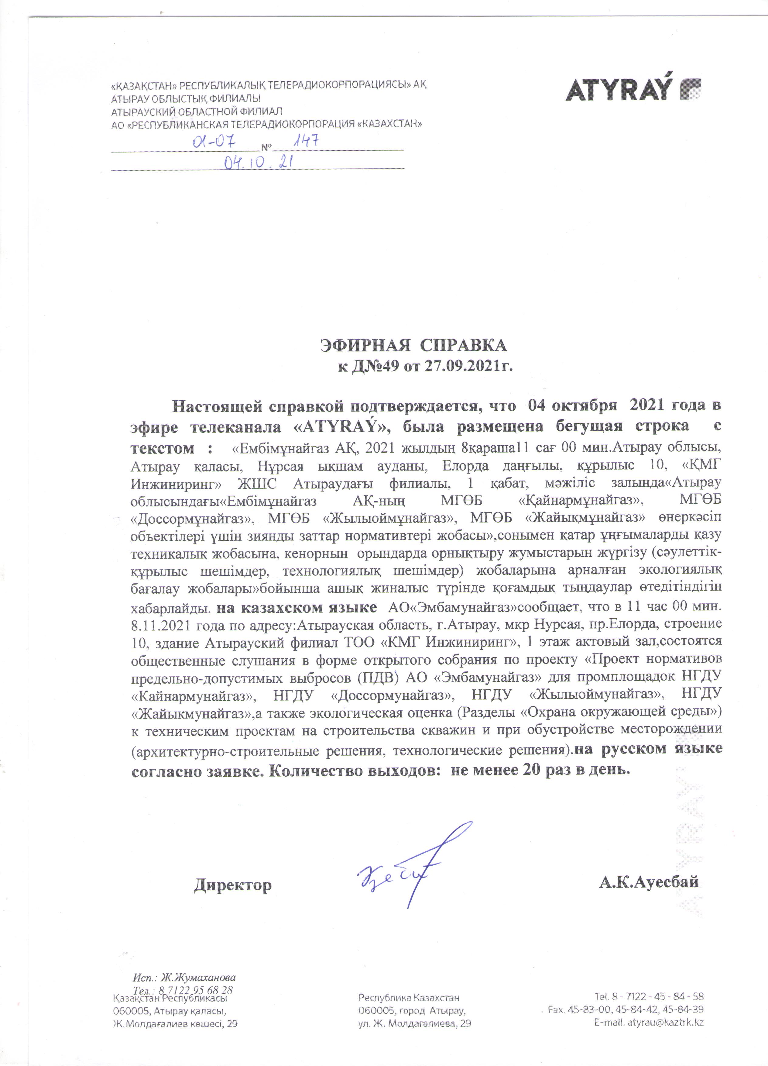 3. Общественные слушания организованны: Управление природных ресурсов и регулирования природопользования Атырауской области, a.aichikova@atyrau.gov.kz,