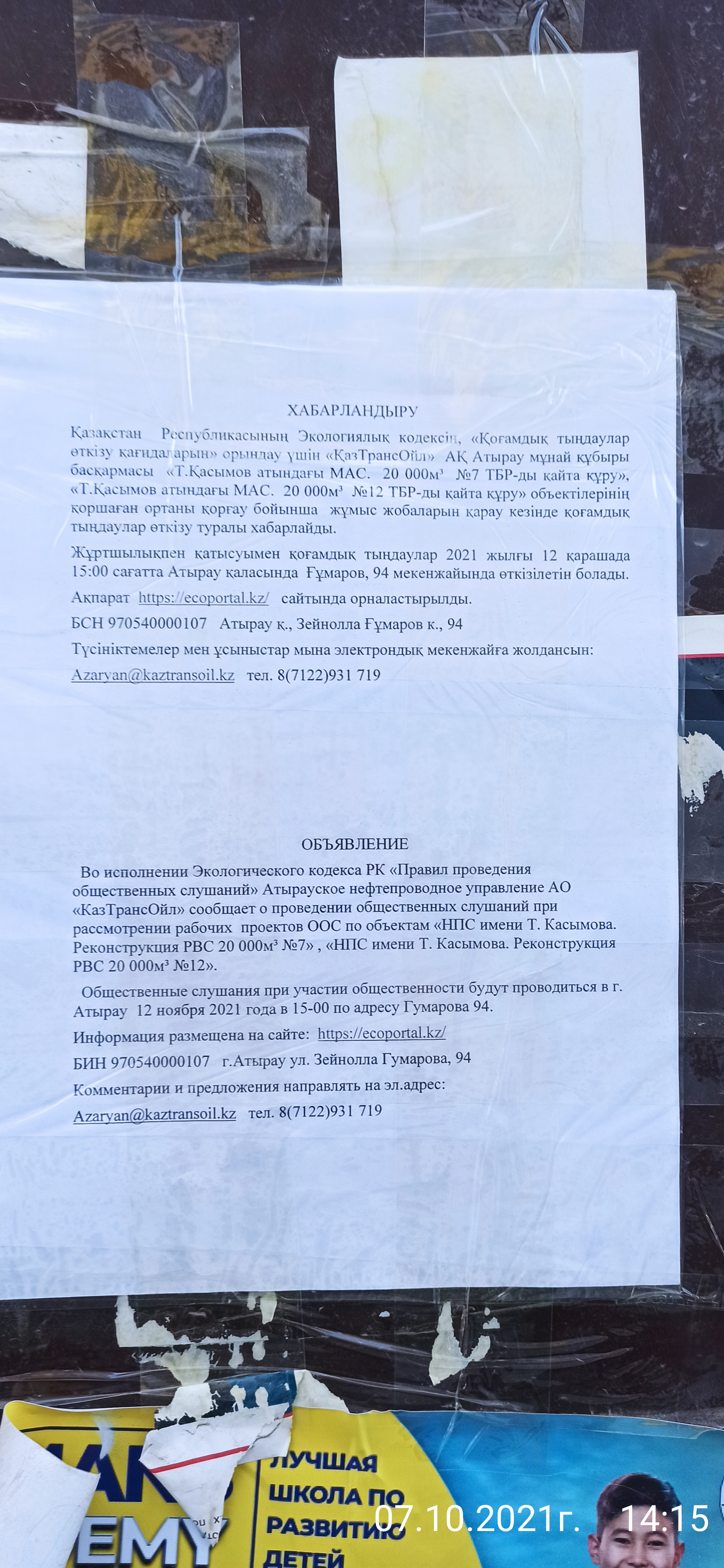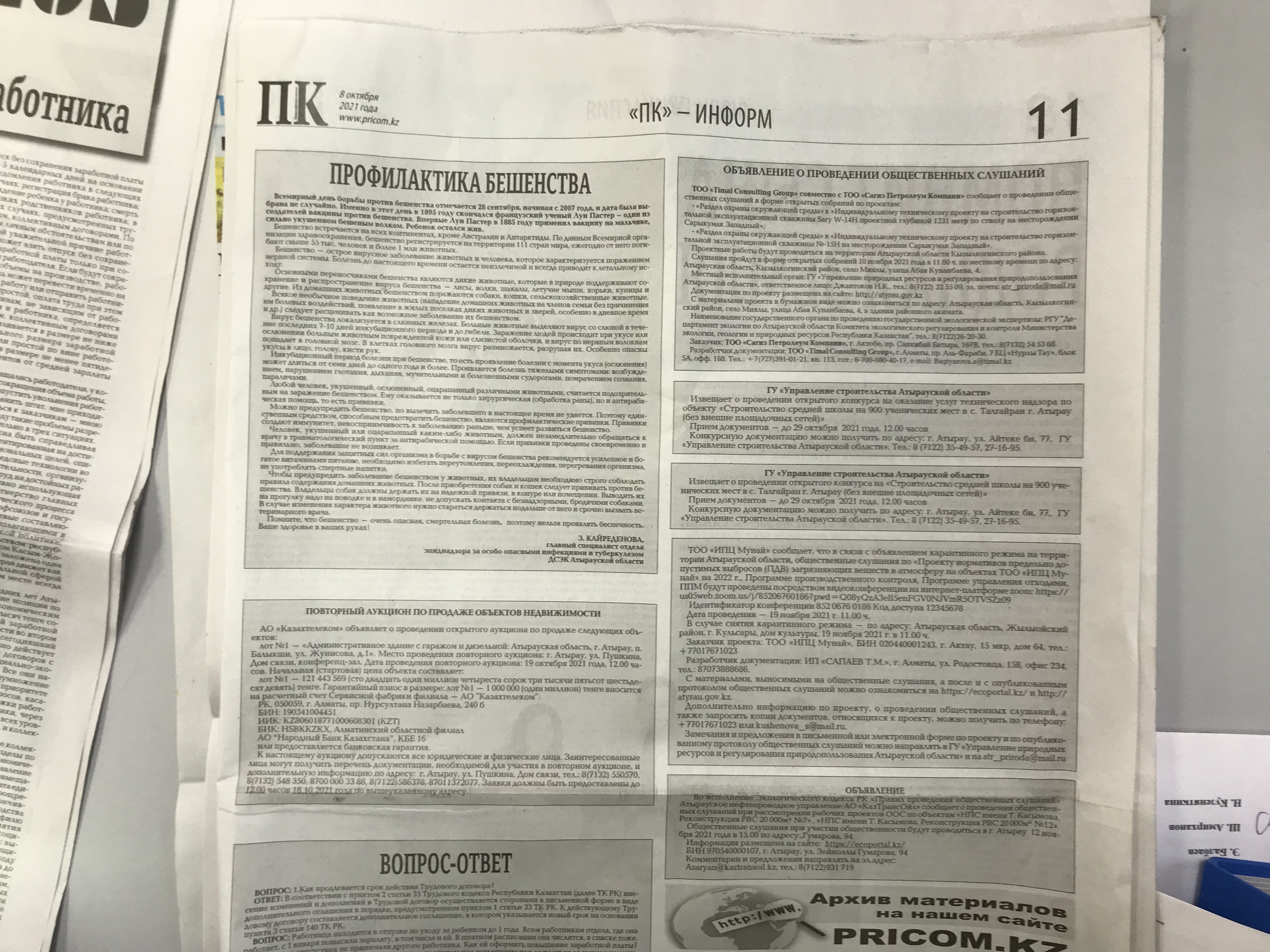 3. Общественные слушания организованны: Управление природных ресурсов и регулирования природопользования Атырауской области, a.aichikova@atyrau.gov.kz,