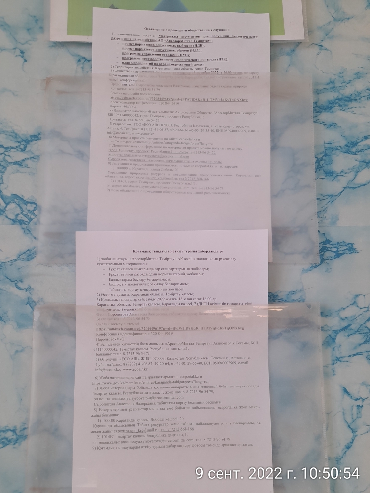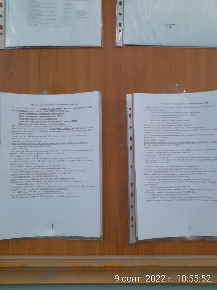 3. Общественные слушания организованны: Управление природных ресурсов и регулирования природопользования Карагандинской области, expertiza.upr_krg@mail.ru,