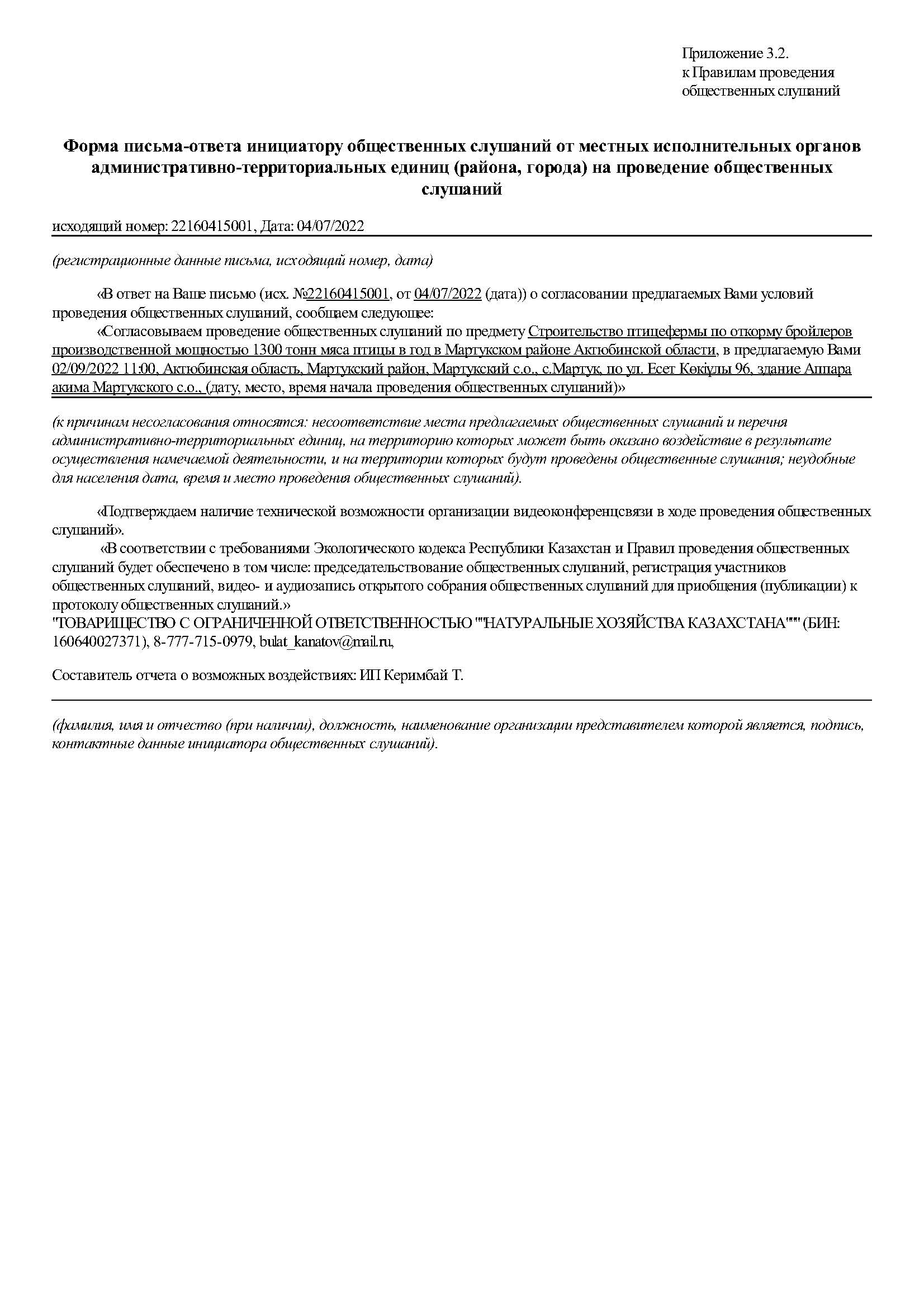 Наименование: Товарищество с ограниченной ответственностью "Натуральные хозяйства Казахстана", Строительство птицефермы по откорму бройлеров производственной мощностью 1300 тонн мяса птицы в год в Мартукском районе Актюбинской области