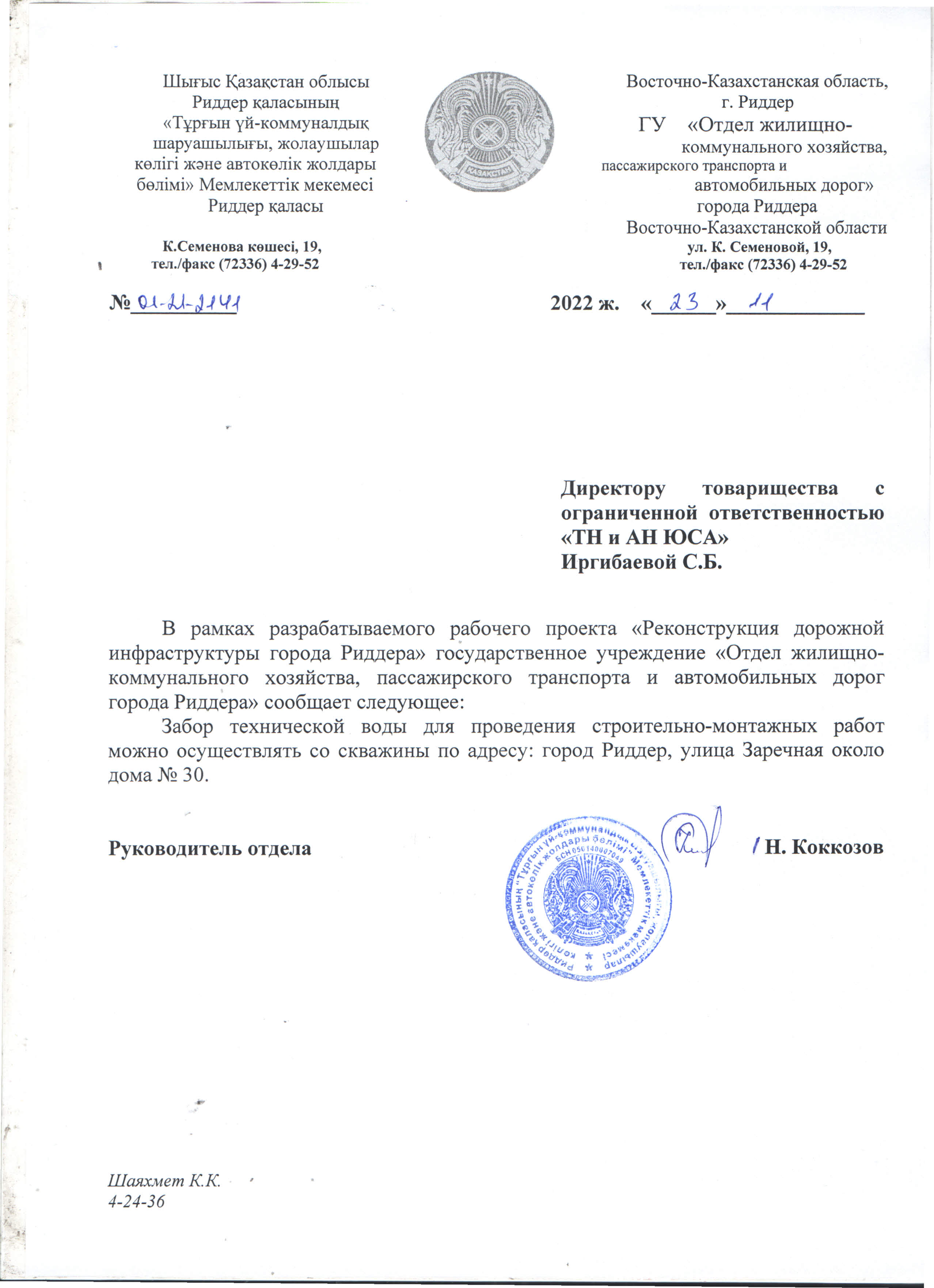 Наименование: ГУ «Отдел жилищно-коммунального хозяйства, пассажирского транспорта и автомобильных дорог города Риддера»